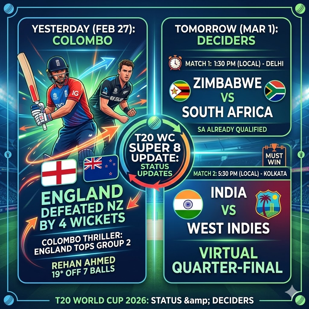 The ICC Men’s T20 World Cup 2026 is reaching a fever pitch. As of February 28, 2026, the Super 8 stage has delivered one of its most dramatic finishes yet, while setting the stage for a “Super Sunday” that will decide the final semi-finalists.