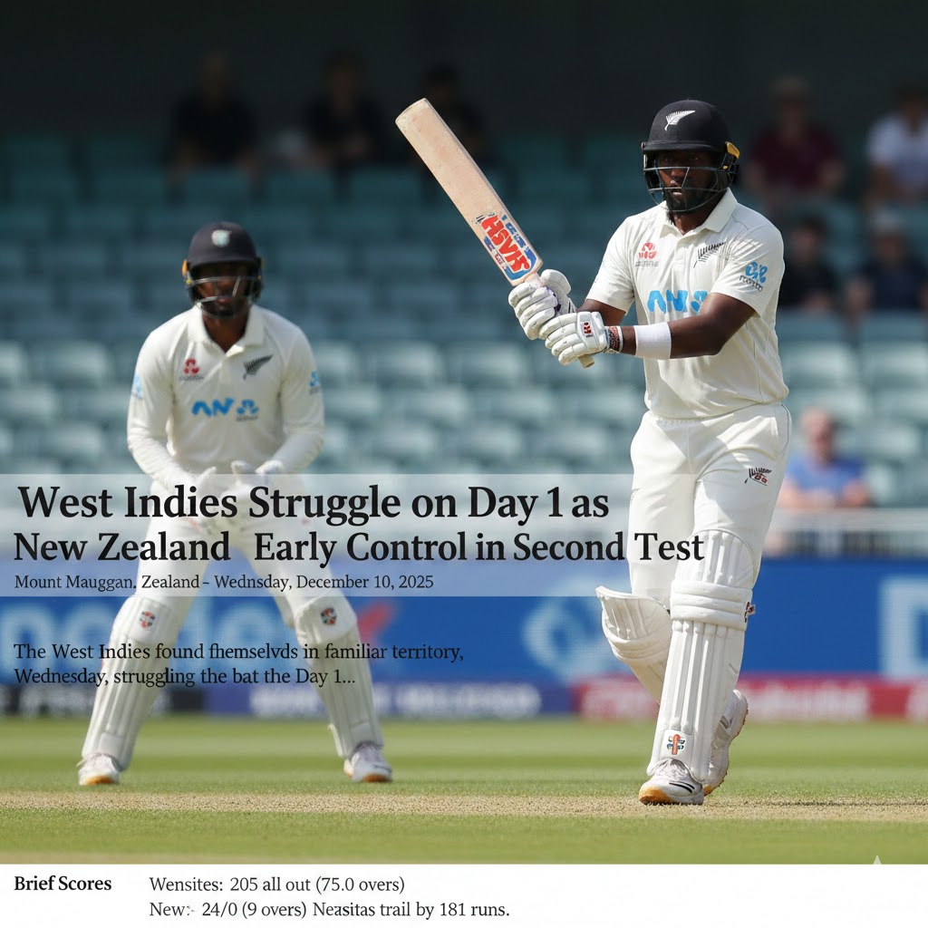 Mount Maunganui, New Zealand – The West Indies found themselves in familiar territory on Wednesday, struggling with the bat on Day 1 of the second Test against New Zealand at Bay Oval. A disciplined New Zealand bowling attack exploited the conditions, skittling the visitors for a modest 205 before their openers safely negotiated the final overs of the day.